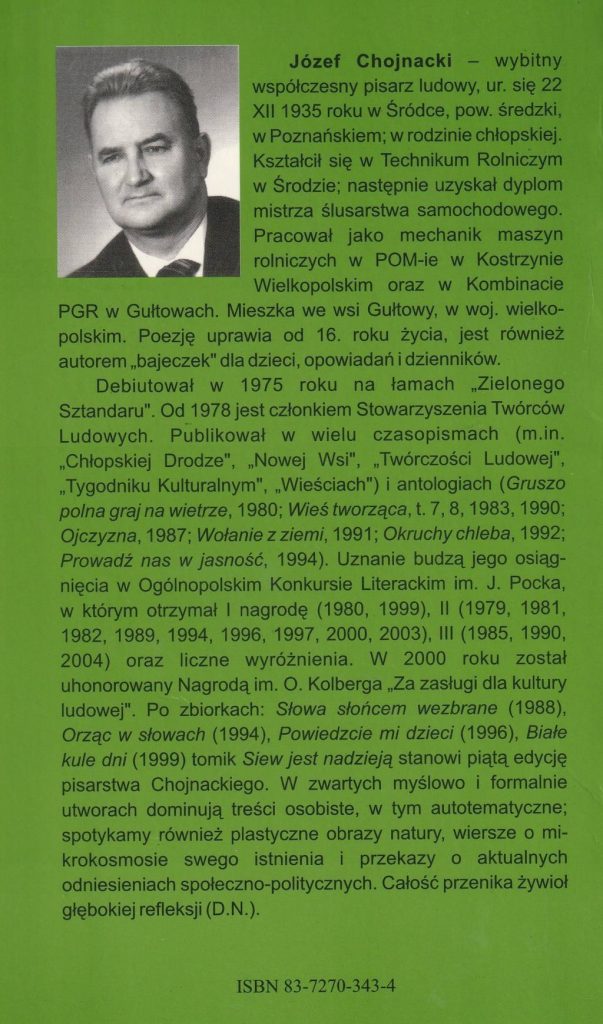 Po wydaniu zbiorku Białe kule dni Józef Chojnacki sądził, że już nic ciekawego nie napisze. W wyniku pewnego wyczerpania literackiego podzielił zdanie znanego poety poznańskiego — Wincentego Różańskiego (przyjaciela Edwarda Stachury), iż po ogłoszeniu kilku tomików coraz trudniej stworzyć coś oryginalnego, wyłamać się z szablonów.