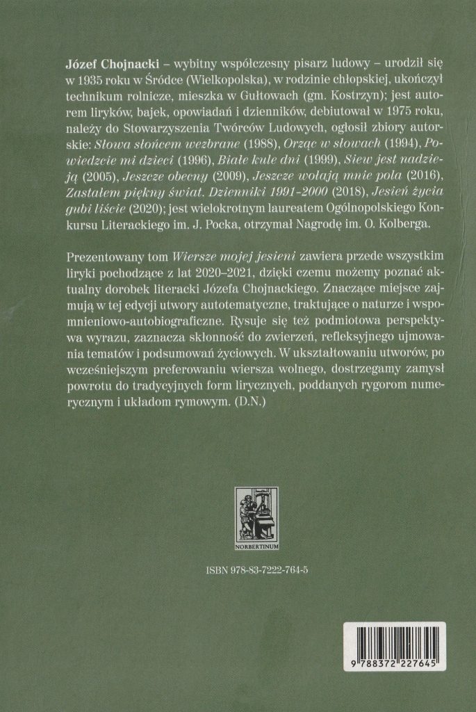 Pozostała część najnowszego zbioru zawiera natomiast wiersze pochodzące z ostatnich lat, tj. z okresu 2020-2021. Dlatego możemy zapoznać się z aktualnym dorobkiem literackim Józefa Chojnackiego. Tylko jeden tekst – niejako programowy – powstał wcześniej, jeszcze w 1992 roku.
